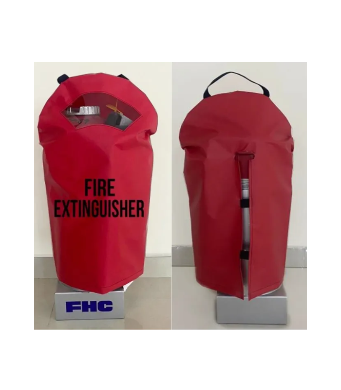 FHC portable Fire Extinguisher Cover, 10 oz vinyl laminated pvc fabric meets the flame retardant standards for NFPA-701. Fits portable (10 lb, 20 lb, 30 lb) pressurized and cartridge-operated extinguishers. Mildew resistant UV resistant, waterproof, resistant to tearing, and meeting the Flame retardant standards NFPA-701.